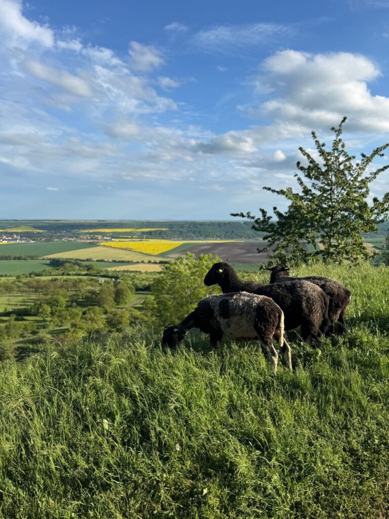 Po stoupání se můžete vydat doleva skrz vinici, kde v sezoně najdete otevřený stánek Třebívlického vinařství (naše vína máme k dispozici i v našem Bistru & Café). Následně vede cesta přes parkoviště, kde můžete během sezóny nakrmit naše ovečky v krmící ohradě.
